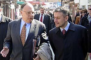 OSCE Chairman-in-Office Solomon Passy (right) and Head of the OSCE Mission to Bosnia and Herzegovina, Bob Beecroft, walk through Sarajevo's marketplace, Bascarsija, 29 March 2004.