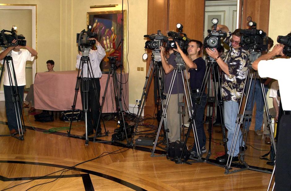 Local and international media waiting for the OSCE Chairman-in-Office to appear after his meeting with Kazakhstan's President Nursultan Nazarbayev, 7 July 2003.