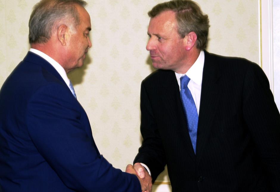 The Chairman-in-Office is greeted by Uzbekistan's President, Islam Karimov, 8 July 2003.