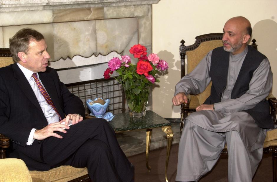 OSCE Chairman-in Office, Dutch Foreign Minister Jaap de Hoop Scheffer, met Afghan President Hamid Karzai during a bilateral visit to Kabul in July 2003.