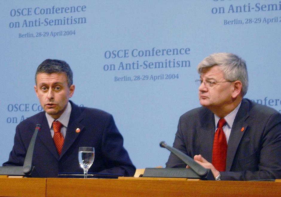 The OSCE Conference on Anti-Semitism ended with a joint press conference by Chairman-in-Office Solomon Passy (left) and German Foreign Minister Joschka Fischer, Berlin, 29 April 2004.