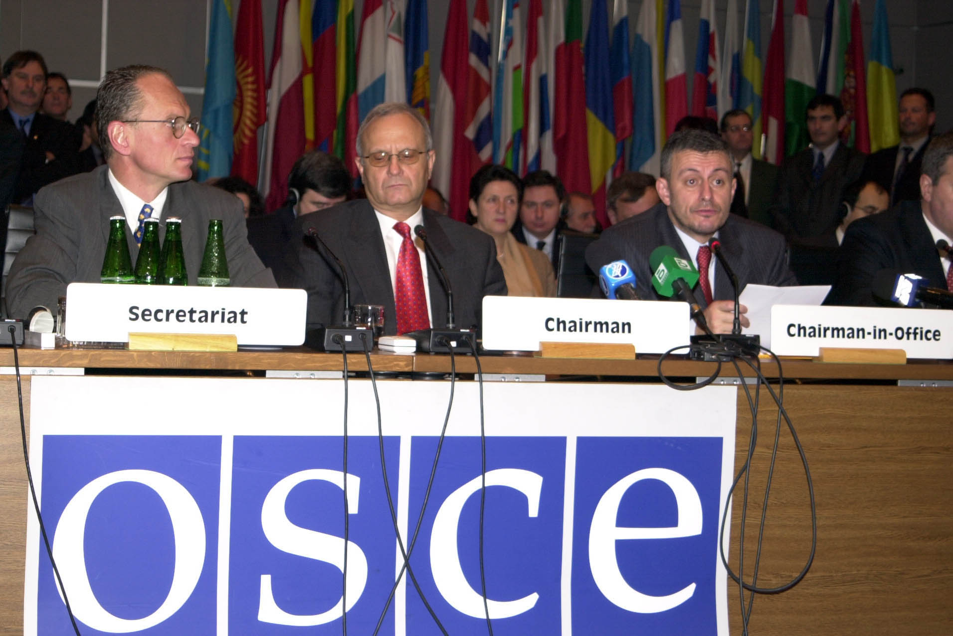 OSCE Chairman-in-Office, Bulgarian Foreign Minister Solomon Passy (right), in his first address to the OSCE Permanent Council in Vienna, 15 January 2004.