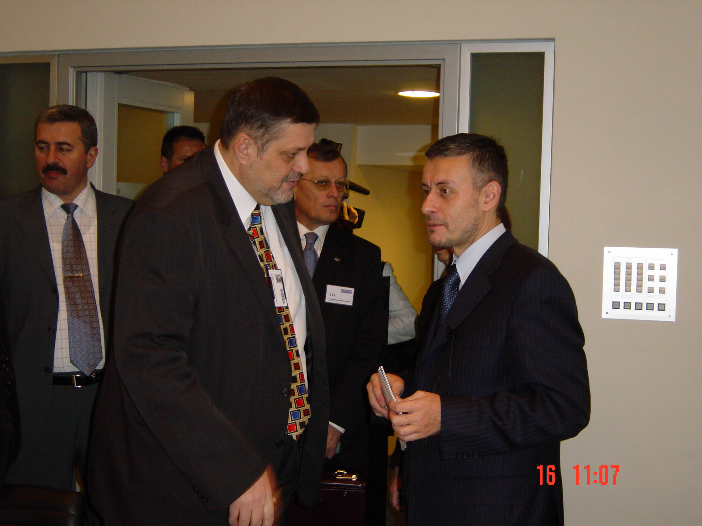 Ambassador Jan Kubis, the OSCE Secretary General (left), and OSCE Chairman-in-Office, Bulgarian Foreign Minister Solomon Passy (right) at the OSCE Troika meeting in Vienna, 16 January 2004.