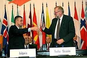 2004 Chairman-in-Office Solomon Passy of Bulgaria (left), symbolically passes the baton of the OSCE Chairmanship to Slovenian Foreign Minister Dimitrij Rupel. Sofia, 7 Dec 2004