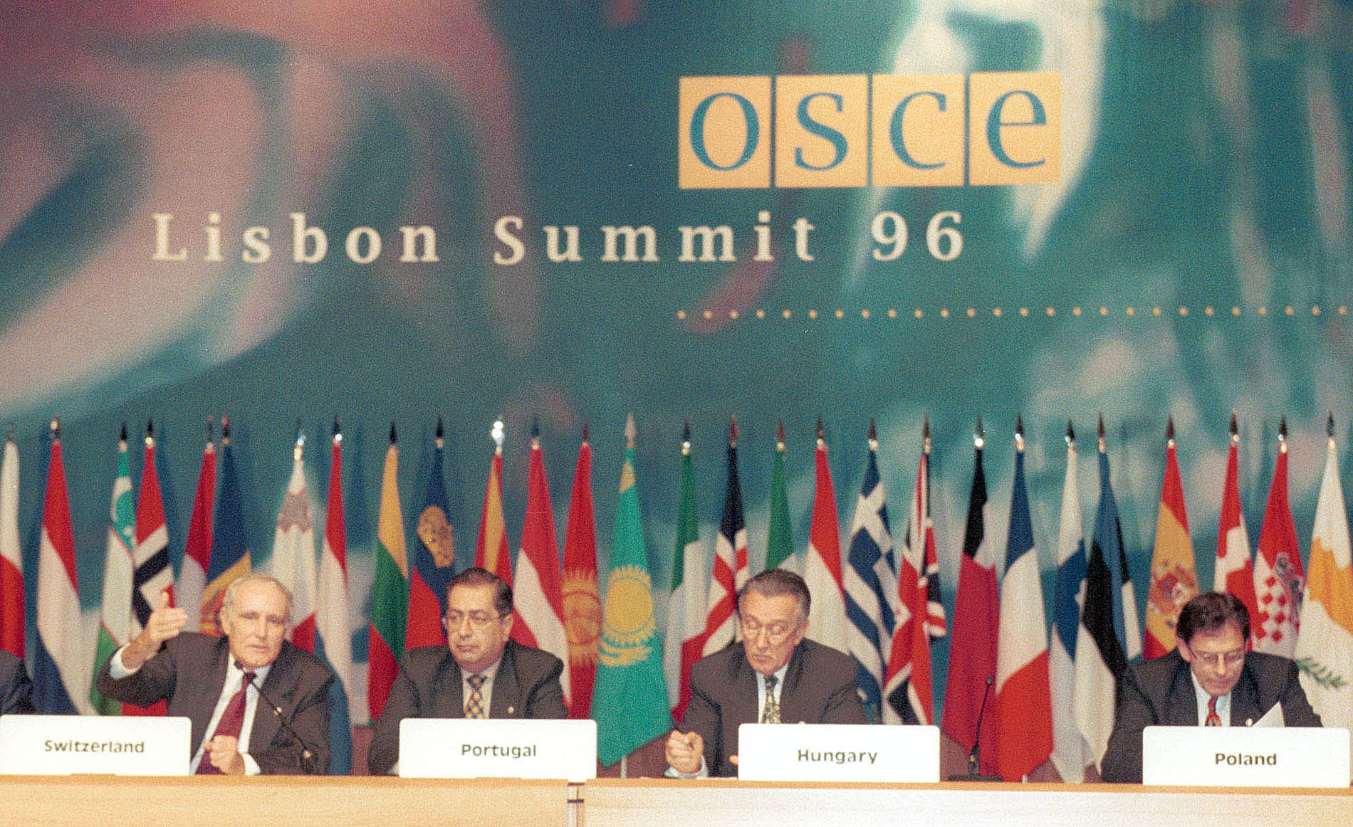 File photo of a press conference at the end of the OSCE 1996 Summit in Lisbon.