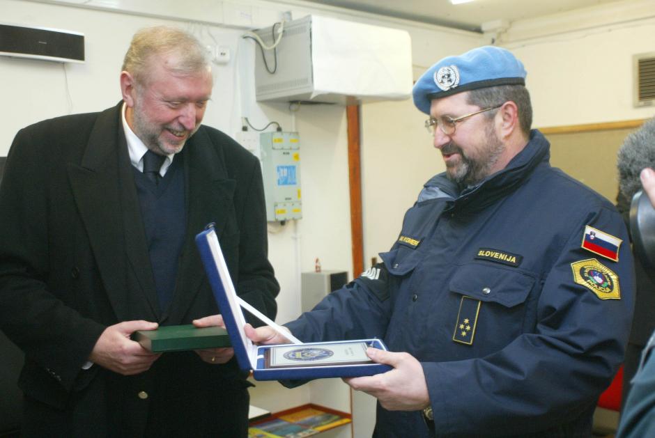 OSCE Chairman-in-Office Dimitrij Rupel (left) meets with Slovenian UNMIK Police Officers in Dragotan, Kosovo, 11 January 2005