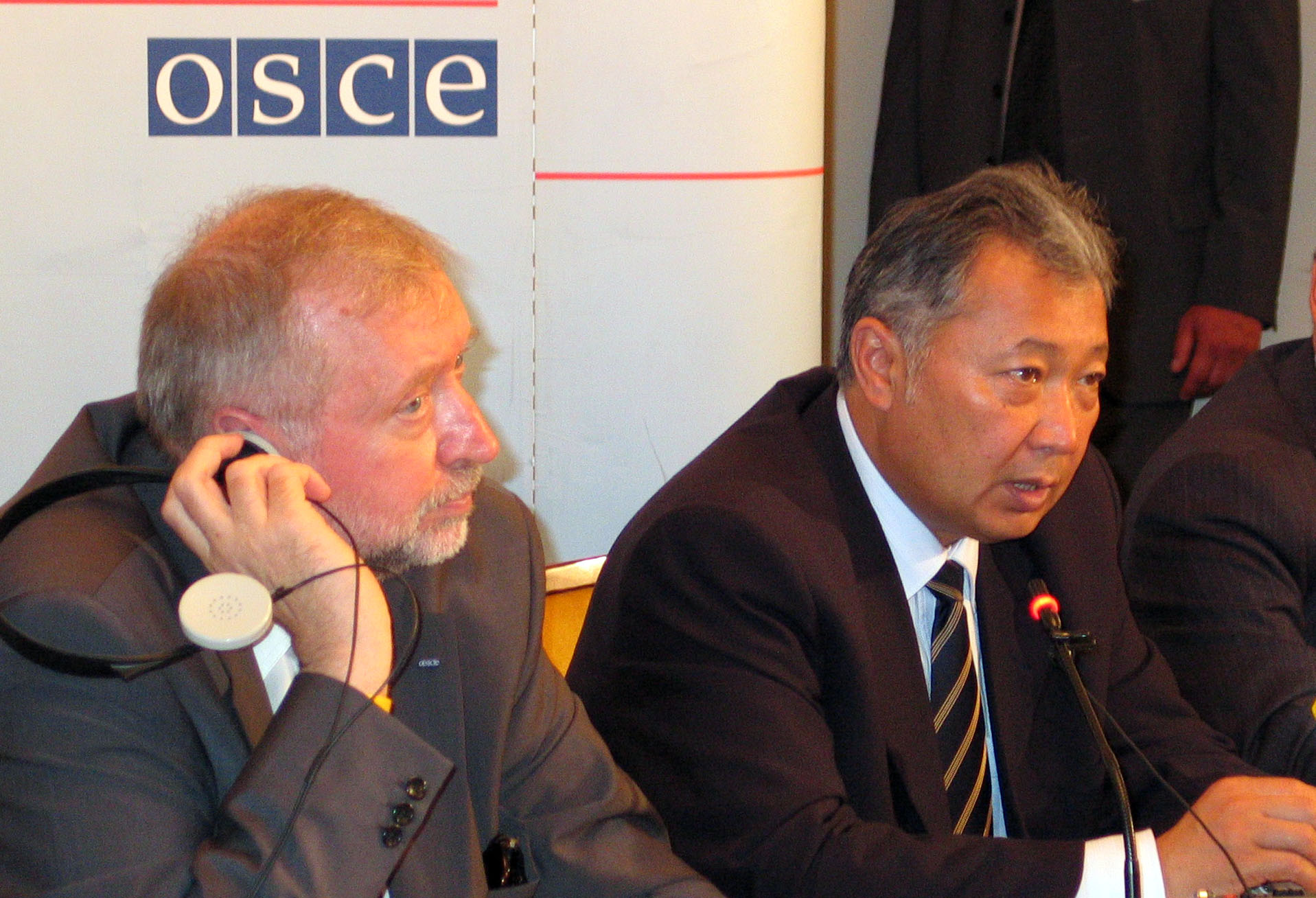 Kyrgyzstan's Acting President Kurmanbek Bakiev (right) and OSCE Chairman-in-Office Dimitrij Rupel at a news conference in Vienna, 30 May 2005.