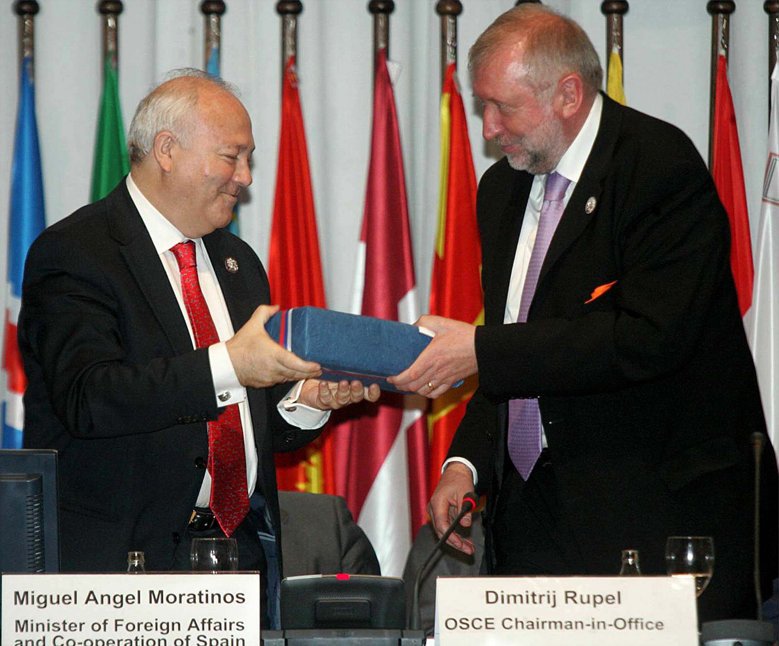 OSCE Chairman-in-Office Dimitrij Rupel, congratulates Spain's Foreign Minister Miguel Angel Moratinos (left) on his birthday, at the OSCE conference on combating anti-Semitism and other forms of intolerance in Cordoba, 8 June 2005.