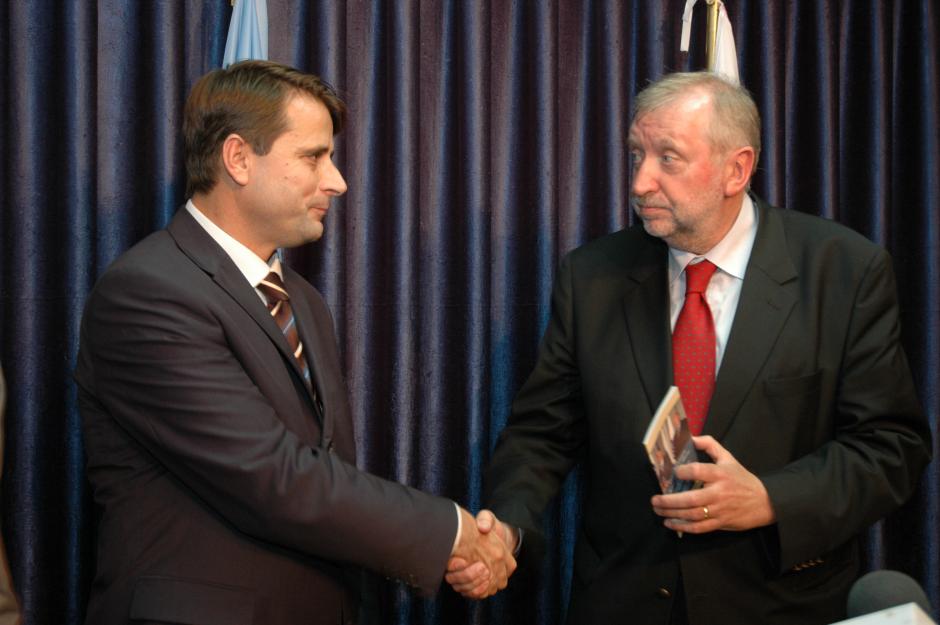 OSCE Chairman-in-Office Dimitrij Rupel (right) meets with Kosovo's Prime Minister Bajram Kosumi in Pristina, 14 October 2005.