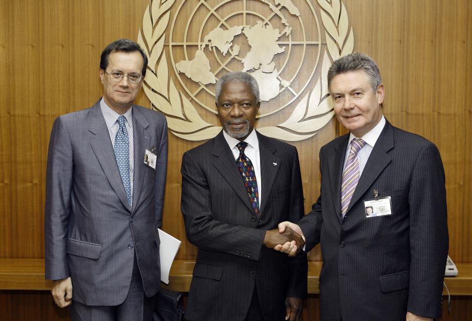 OSCE Chairman-in-Office Karel De Gucht (right) and the Organization's Secretary General Marc Perrin de Brichambaut (left) are welcomed to the UN by Secretary-General Kofi Annan, New York, 26 June 2006.