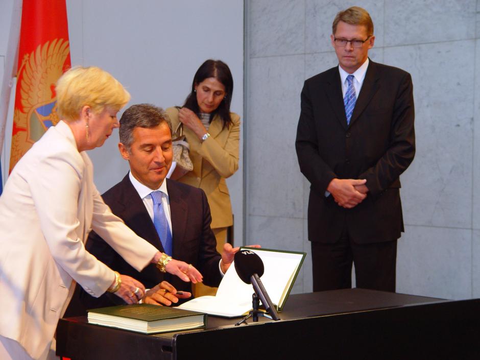 Montenegro's Prime Minister Milo Djukanovic signs the 1975 Final Act of the Conference on Security and Co-operation in Europe, in Helsinki, 1 September 2006. The OSCE was the first international organization Montenegro joined after gaining independence.