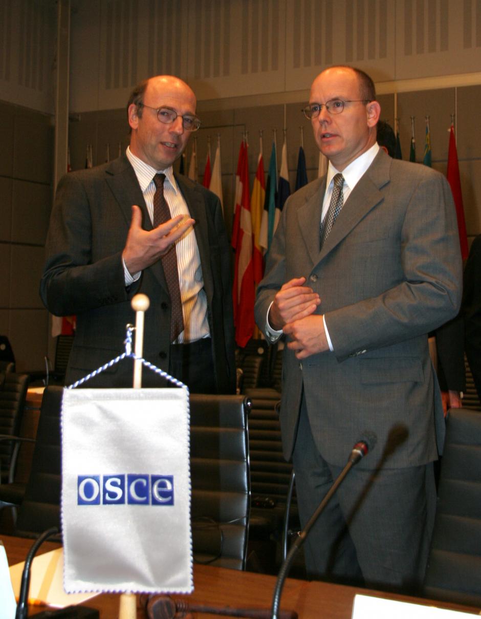 Prince Albert II of Monaco with the head of Belgium's delegation to the OSCE, Ambassador Bertrand De Crombrugghe (Left), at the Hofburg in Vienna, 18 September 2006.