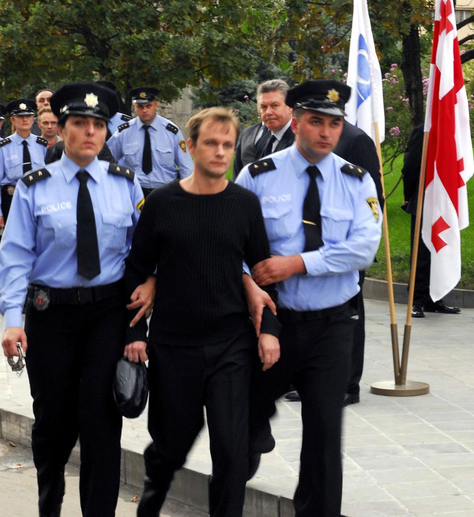 Georgian police escorting one of four Russian officers, Arkady Zavgorodny, charged with espionage, in Tbilisi, 2 October 2006. The four were handed over to the OSCE, in the presence of Chairman De Gucht, and later returned to Russia.