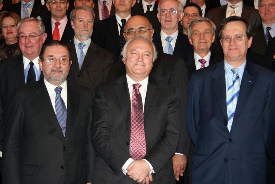 Permanent Council Chairman Amb. Carlos Sanchez de Boado of Spain (left), OSCE Chairman-in-Office Miguel Angel Moratinos (centre), Secretary General Marc Perrin de Brichambaut and other officials pose for a family photo at the Hofburg, 11 January 2007.