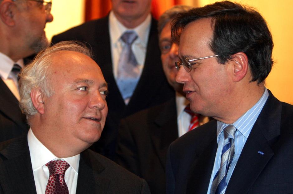 OSCE Chairman-in-Office Miguel Angel Moratinos (left) speaks with the Organization's Secretary General Marc Perrin de Brichambaut in Vienna, 11 January 2007.