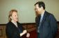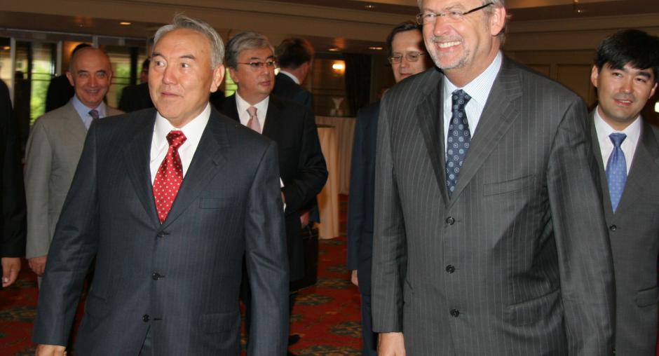 Kazakhstan President Nursultan Nazarbayev (left) is welcomed by Special Envoy of the OSCE Chairman-in-Office, Pierre Chevalier, before the Almaty meeting on promoting tolerance, inter-cultural, inter-religious and inter-ethnic understanding, 12 June 2006. (OSCE/Mikhail Evstafiev)