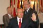 Kazakhstan President Nursultan Nazarbayev waves as he leaves an OSCE meeting on tolerance, Almaty, 12 June 2006. The Special Envoy of the OSCE Chairman-in-Office, Pierre Chevalier (right), looks on. (OSCE/Mikhail Evstafiev)
