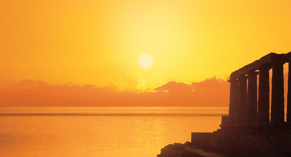 The sun sets at Cape Sounion on the Attica peninsula in Greece, the site of the ruins of the ancient Greek temple of Poseidon. (Greek National Tourism Organisation)