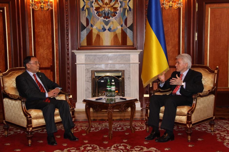 The OSCE Chairperson-in-Office, Kazakhstan's Secretary of State and Foreign Minister, Kanat Saudabayev (l) meets the Speaker of the Ukrainian parliament, Volodymyr Lytvin in Kyiv, 31 March 2010.