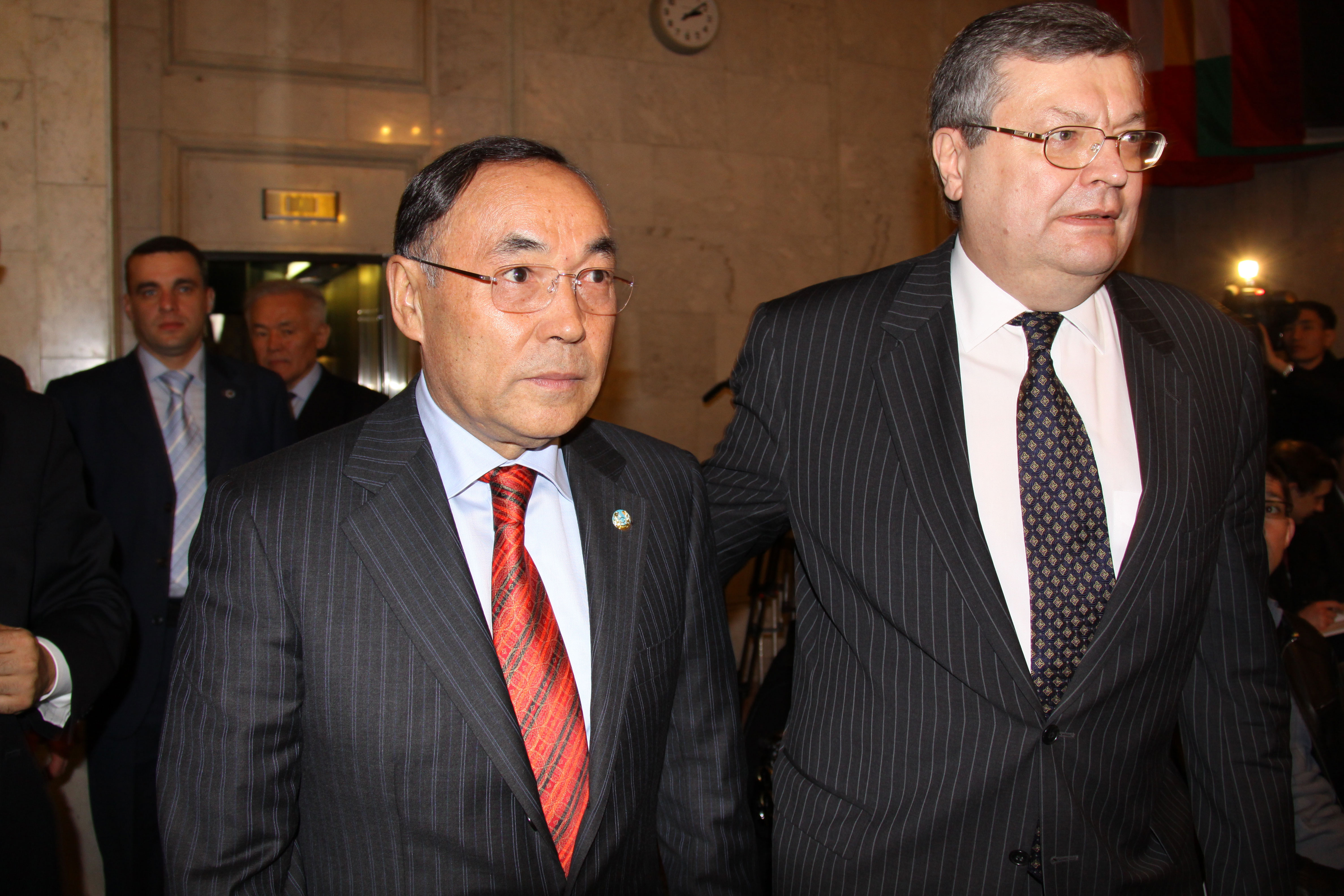 The OSCE Chairperson-in-Office, Kazakhstan's Secretary of State and Foreign Minister, Kanat Saudabayev (l) with Ukraine's Minister of Foreign Affairs, Kostyantyn Gryschenko, in Kyiv, 31 March 2010.