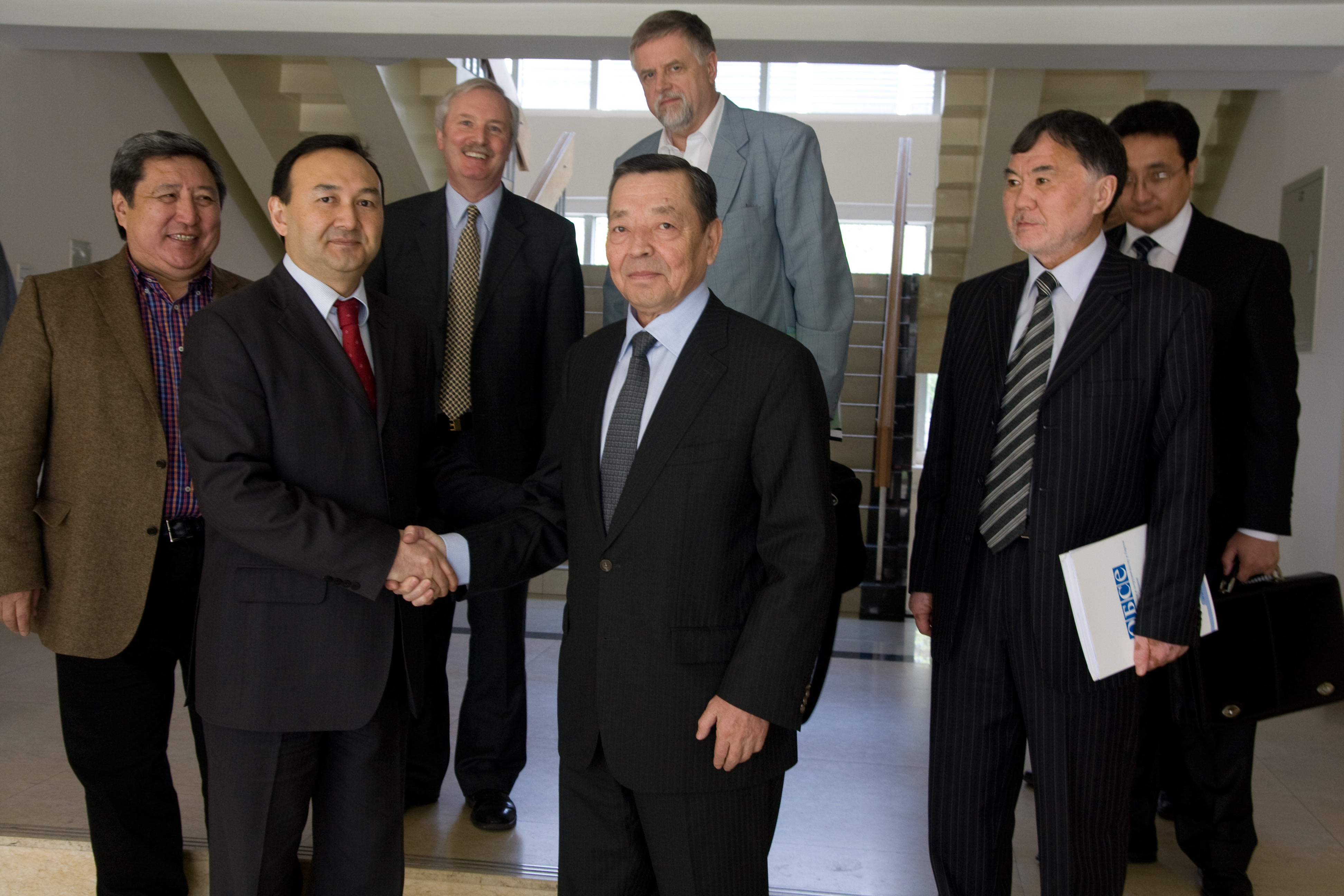 Special Envoy of the OSCE Chairperson-in-Office, Zhanybek Karibzhanov (r) greets interim Kyrgyz Deputy Foreign Minister Nurlan Aytmurzaev in Bishkek, 9 April 2010. Behind them are Ambassadors Andrew Tesoriere (Centre in Bishkek) and Herbert Salber (CPC).