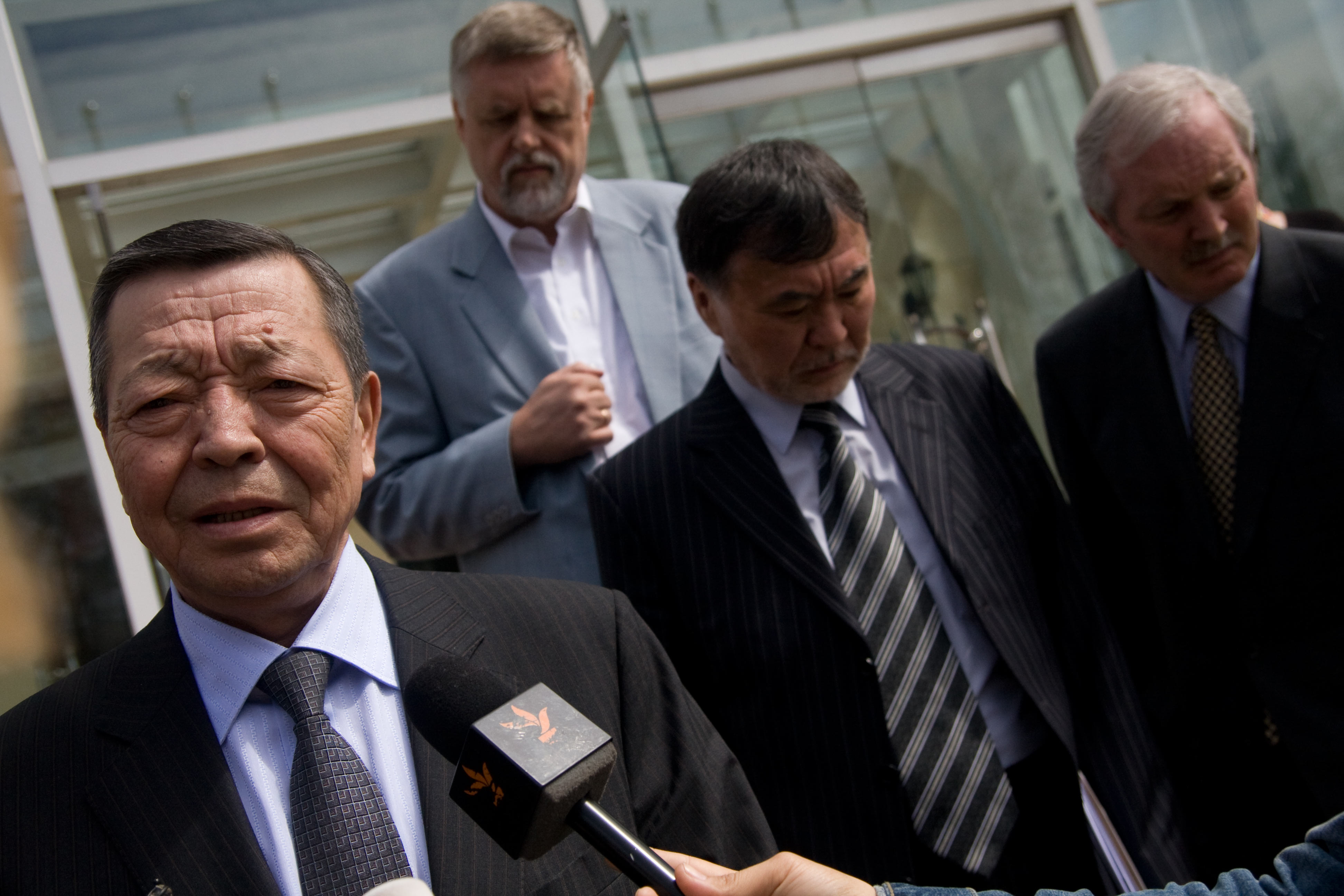 Zhanybek Karibzhanov (l), Special Envoy of the OSCE Chairperson-in-Office, is interviewed by the media in Bishkek, 9 April 2010. Also pictured are Ambassadors Andrew Tesoriere (r, Centre in Bishkek) and Herbert Salber (2nd l, CPC).