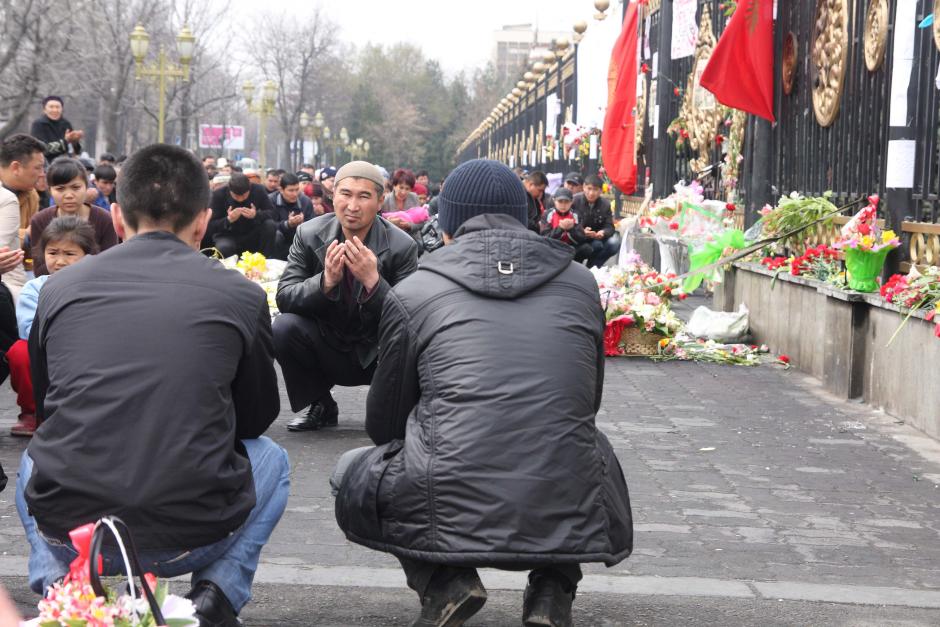 People pray for those killed in the violence outside the gates of the White House in Bishkek, 11 April 2010.