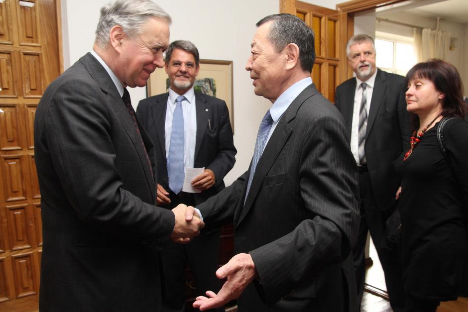 The Special Envoy of the OSCE Chairperson-in-Office Zhanybek Karibzhanov (r) meets EU Special Representative for Central Asia Pierre Morel (l), in Bishkek, 11 April 2010. Looking on is the German Ambassador in Kyrgyzstan, Holger Gren (c).