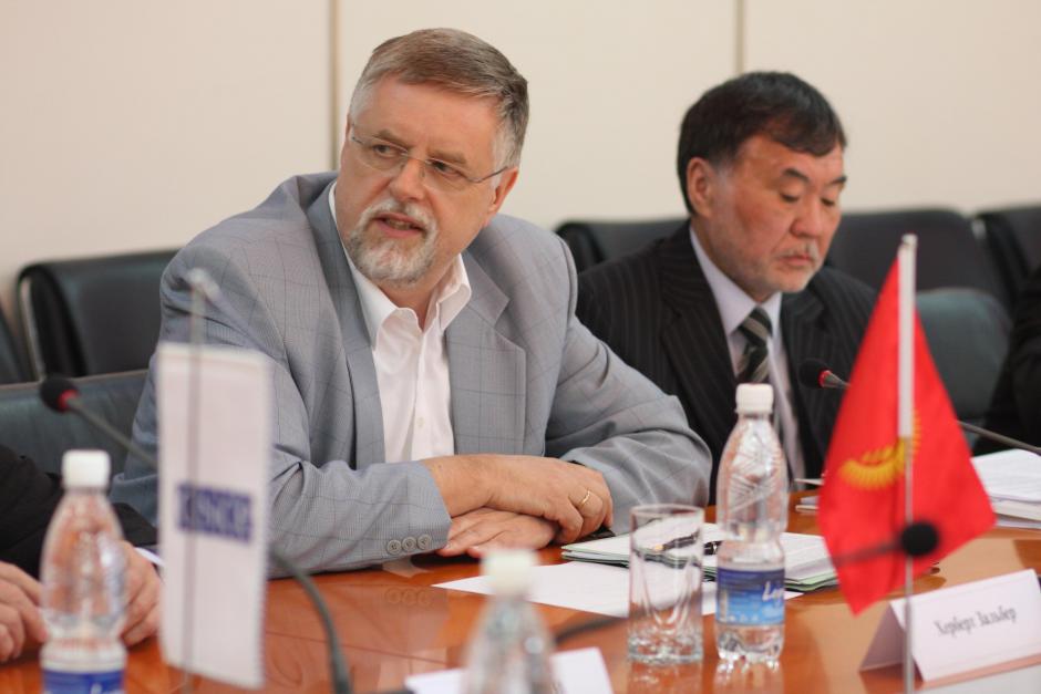 Ambassador Herbert Salber (l), Director of the OSCE Conflict Prevention Centre, at a meeting in Bishkek, 9 April 2010.