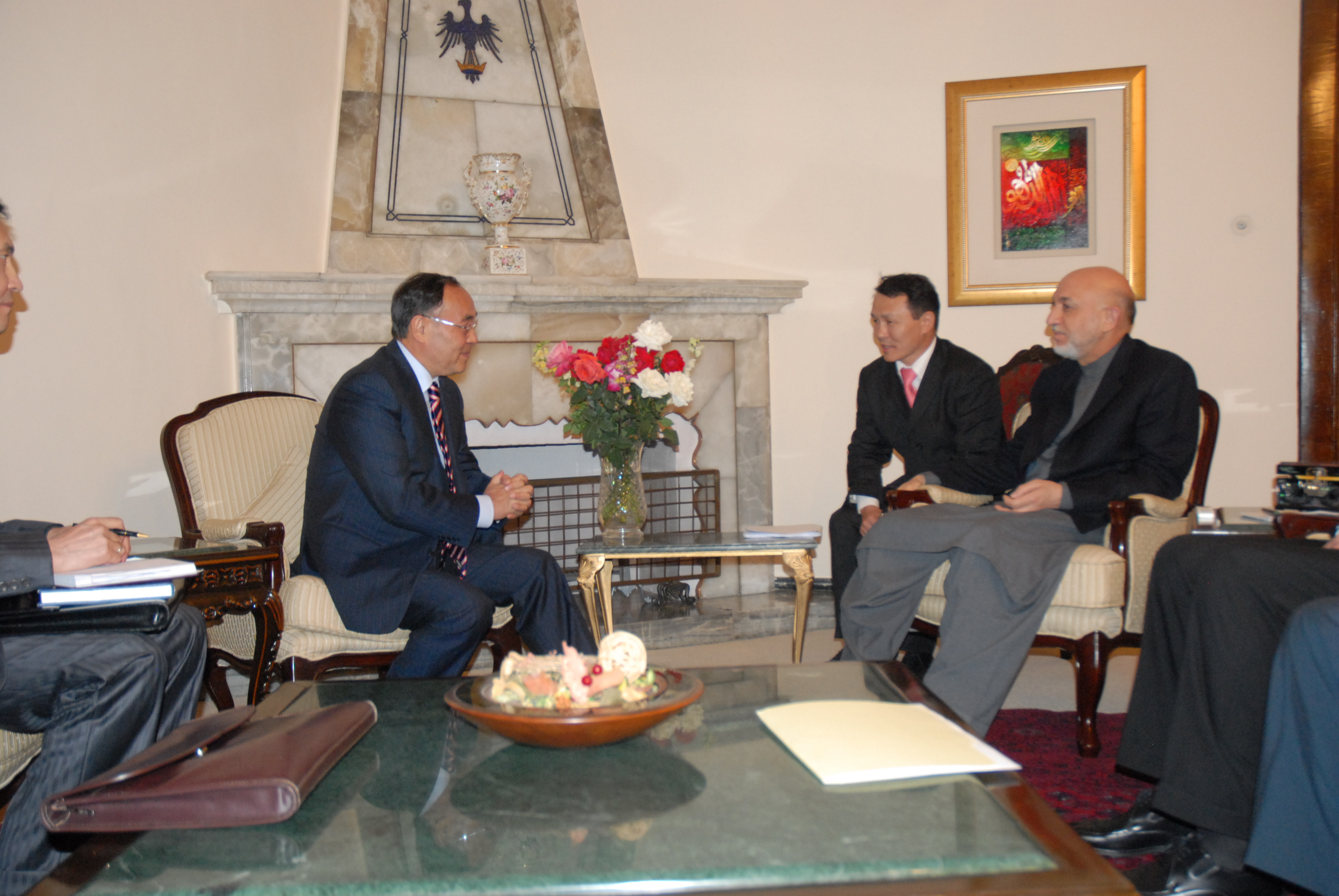 The OSCE Chairperson-in-Office, Kazakhstan's Secretary of State and Foreign Minister Kanat Saudabayev (l) meets Afghan President Hamid Karzai in Kabul, 17 May 2010.