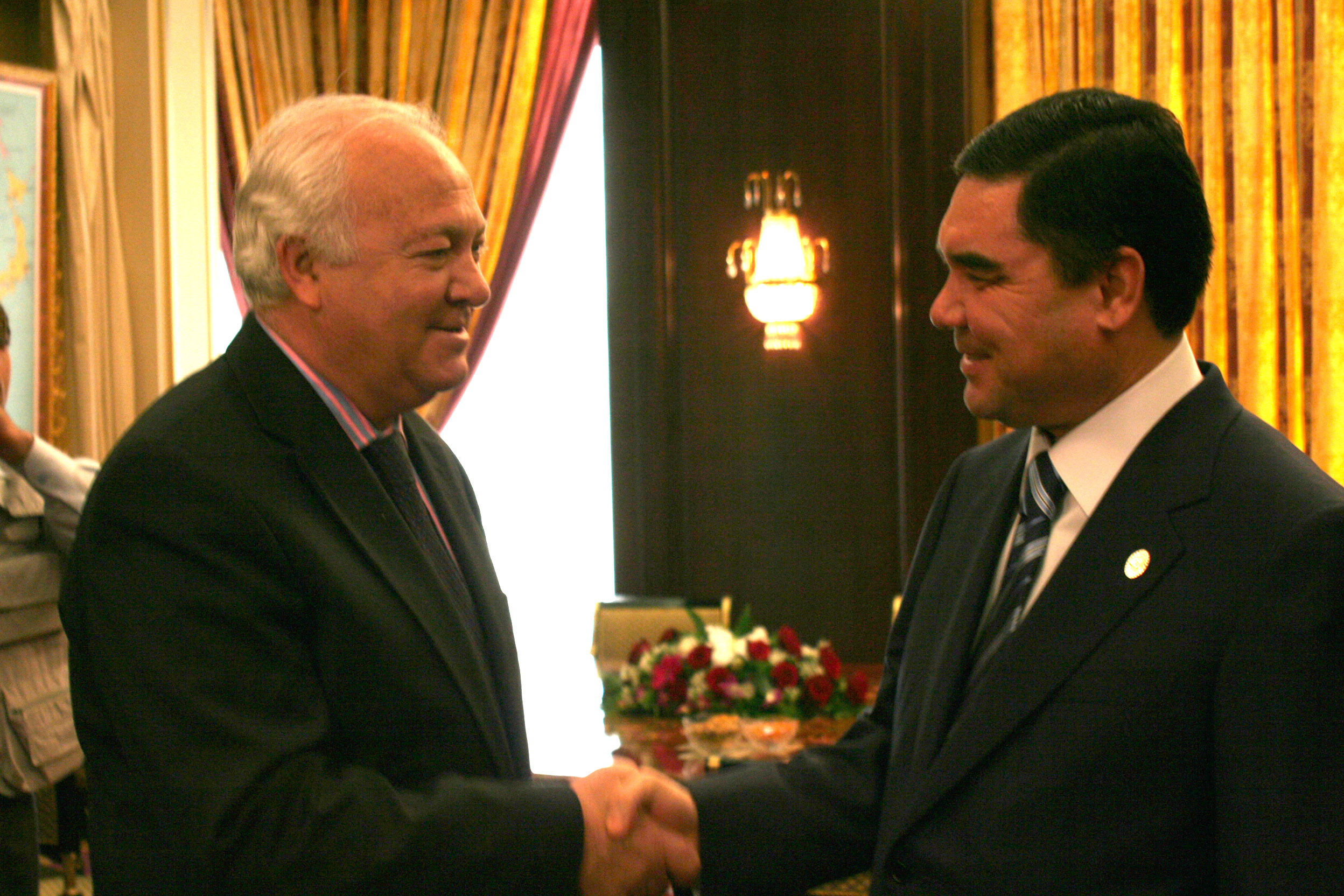 OSCE Chairman Miguel Angel Moratinos (left) welcomed by Turkmenistan President Gurbanguly Berdymukhammedov, in Ashgabat, 12 April 2007.