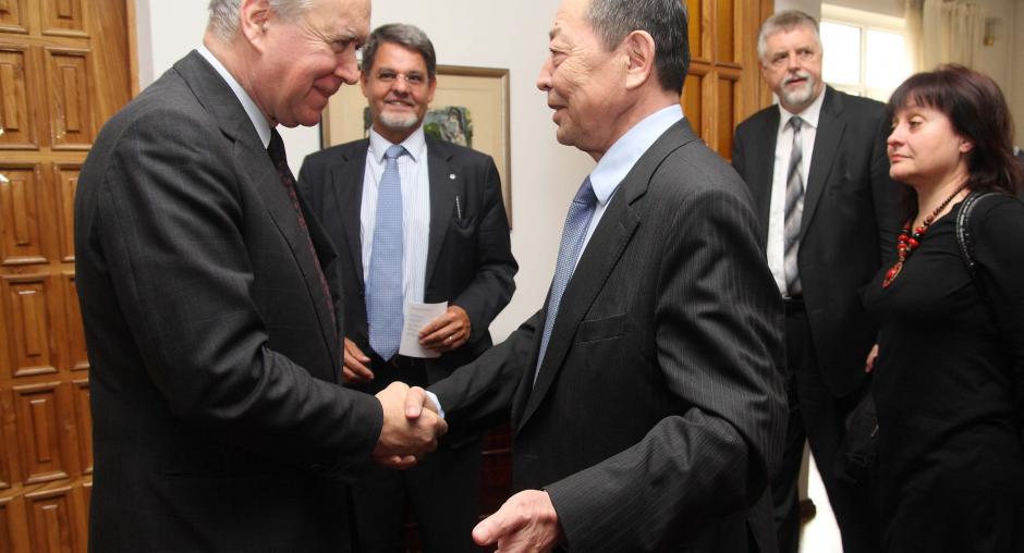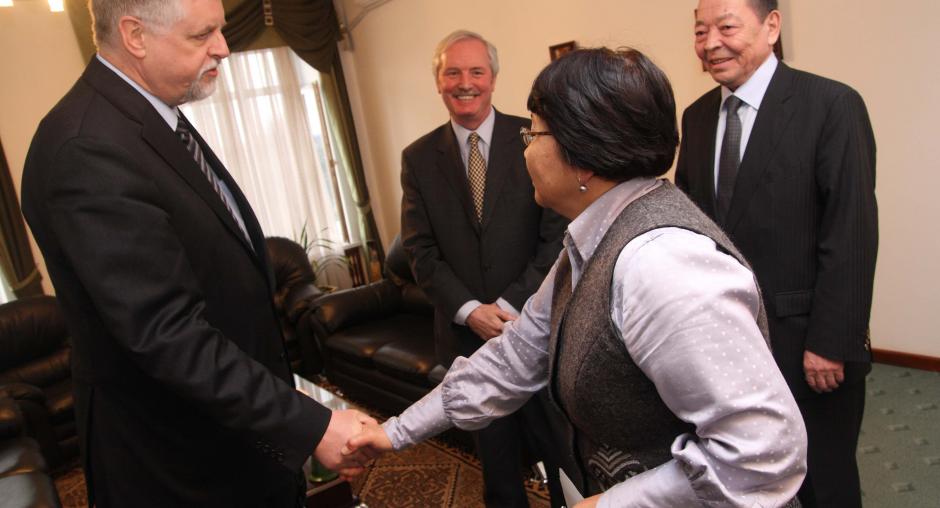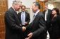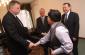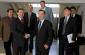Special Envoy of the OSCE Chairperson-in-Office, Zhanybek Karibzhanov (r) greets interim Kyrgyz Deputy Foreign Minister Nurlan Aytmurzaev in Bishkek, 9 April 2010. Behind them are Ambassadors Andrew Tesoriere (Centre in Bishkek) and Herbert Salber (CPC). (OSCE/Malik Alymkulov)