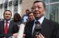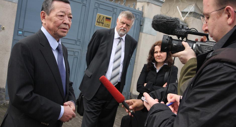 Zhanybek Karibzhanov, Special Envoy of the OSCE Chairperson-in-Office, is interviewed by the media in Bishkek, 9 April 2010. On the left is interim Kyrgyz Deputy Foreign Minister Nurlan Aytmurzaev. (OSCE/Malik Alymkulov)
