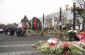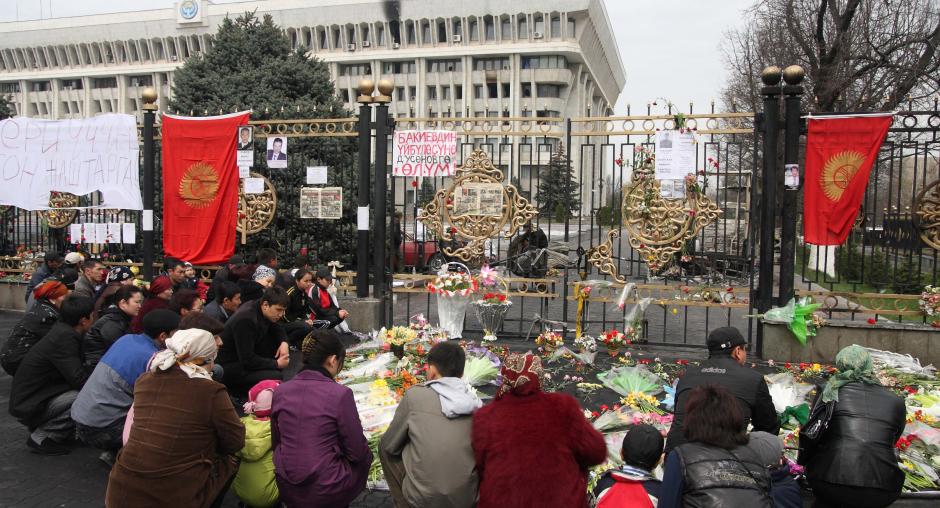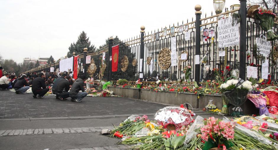 People pray beside flowers laid outside the gates of the White House in Bishkek in tribute to those killed in the violence, 11 April 2010. (OSCE/Malik Alymkulov)