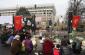 People pray for those killed in the violence outside the gates of the White House in Bishkek, 11 April 2010. The placard in red on the gates reads "Death to the Bakiev family and Daniyar Usenov" [the former Kyrgyz Prime Minister]. (OSCE/Malik Alymkulov)