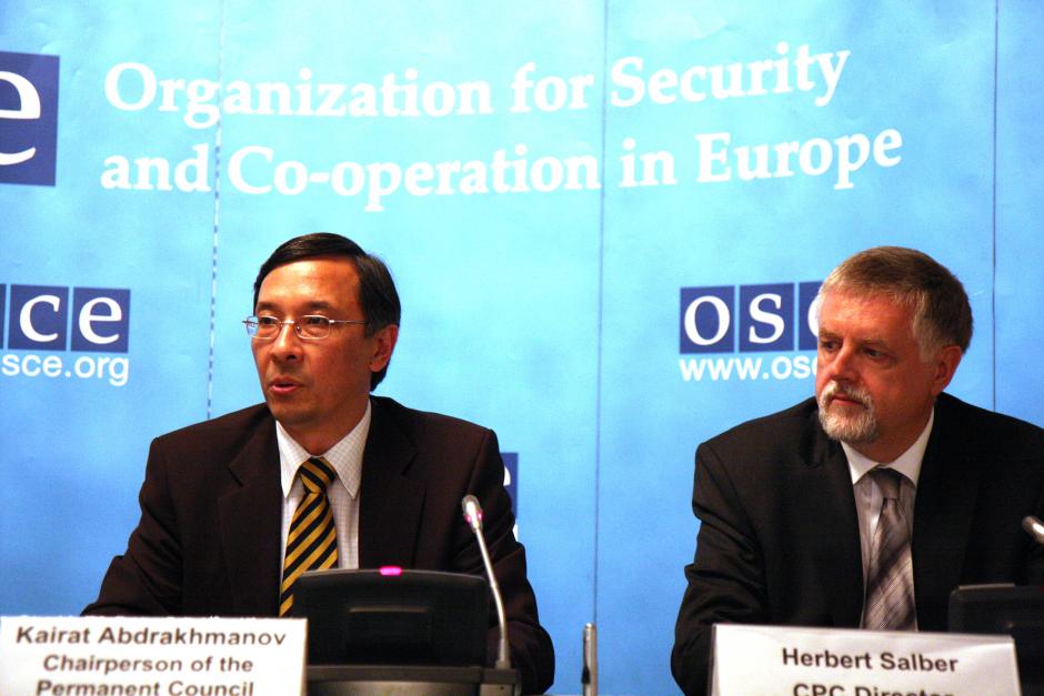 The Chairperson of the OSCE Permanent Council, Ambassador Kairat Abdrakhmanov, and OSCE Conflict Prevention Centre Director Herbert Salber, speak to journalists about the deployment of a Police Advisory Group to Kyrgyzstan. Vienna, 22 July 2010.