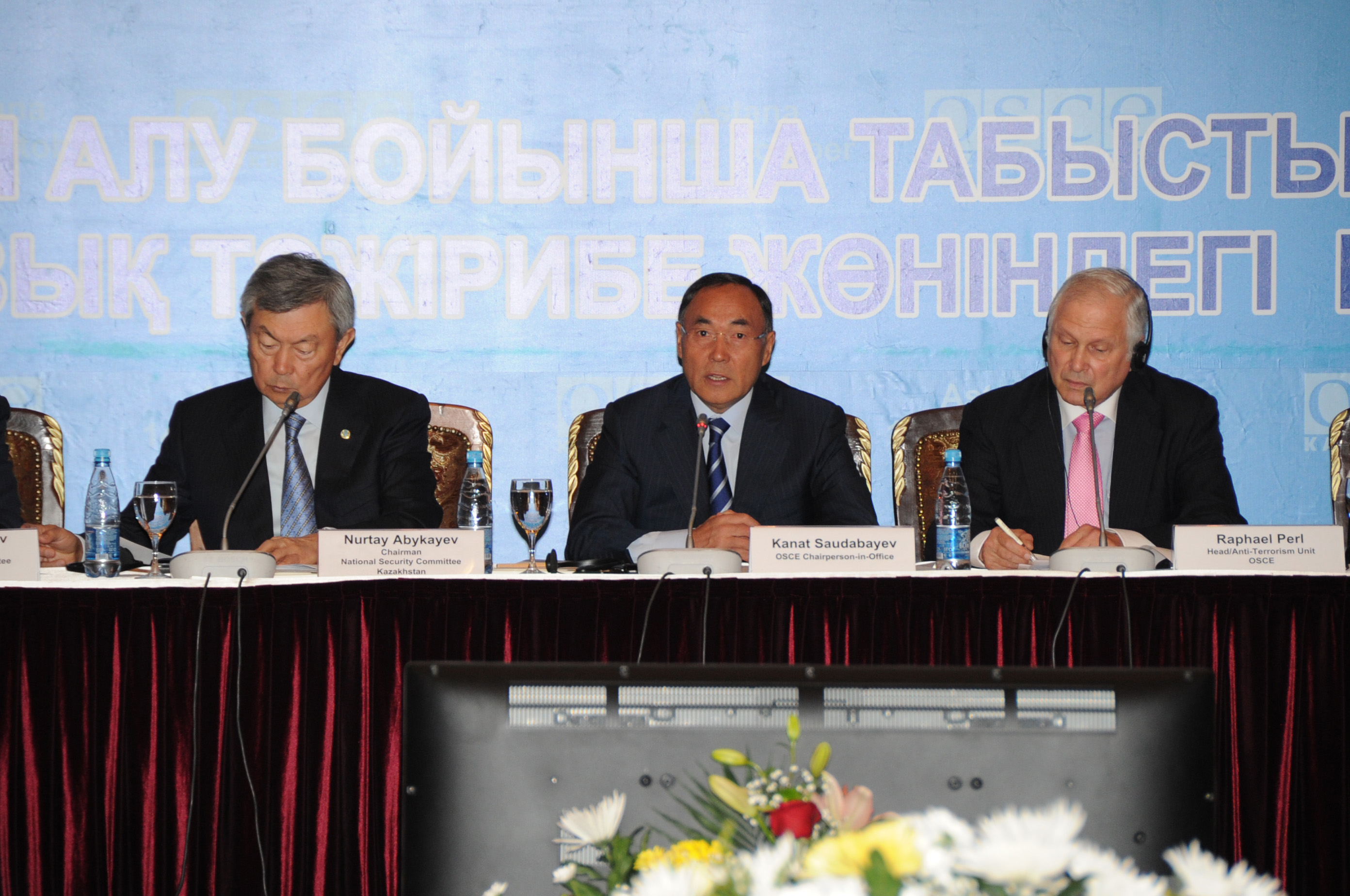 L-r: Nurtay Abykayev, Chairman of National Security Committee of Kazakhstan; Kanat Saudabayev, OSCE Chairperson-in-Office; and Raphael Perl, Head of the OSCE Action against Terrorism Unit, at a conference on anti-terrorism, Astana, 14 October 2010.