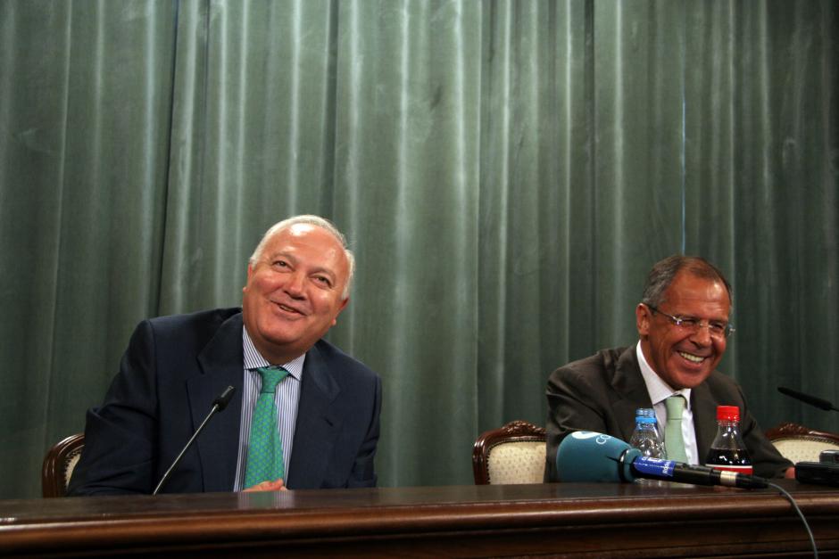 OSCE Chairman-in-Office, Spanish Foreign Minister Miguel Angel Moratinos (left), shares a light moment with Russian Foreign Minister Sergey Lavrov at a news conference in Moscow, 30 August 2007.