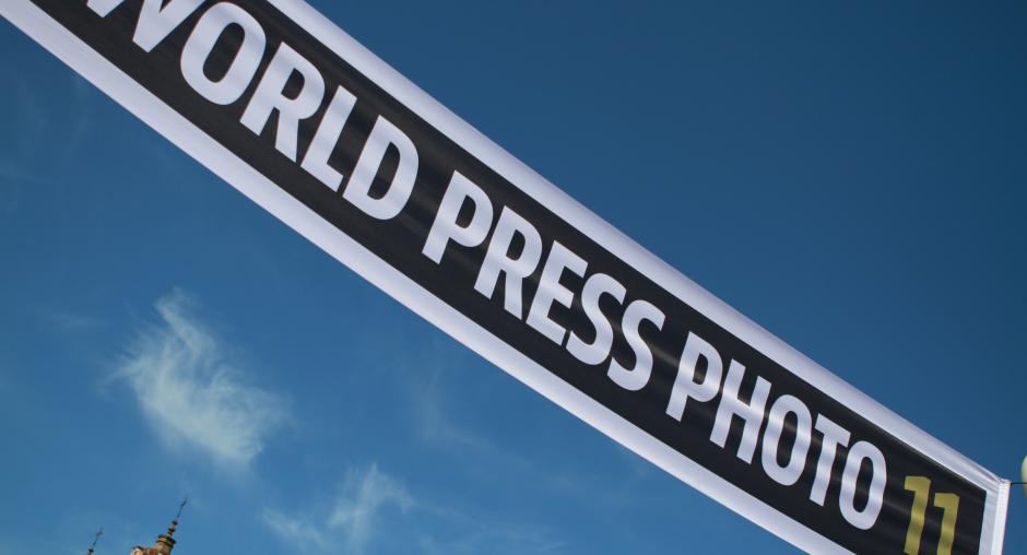 The OSCE Chairperson-in-Office, Lithuanian Foreign Minister Audronius Ažubalis (r), on a tour of the World Press Photo exhibition, given by the Co-ordinator, Micha Bruinvels, Vilnius, 6 June 2011. (OSCE/Jonathan Perfect)