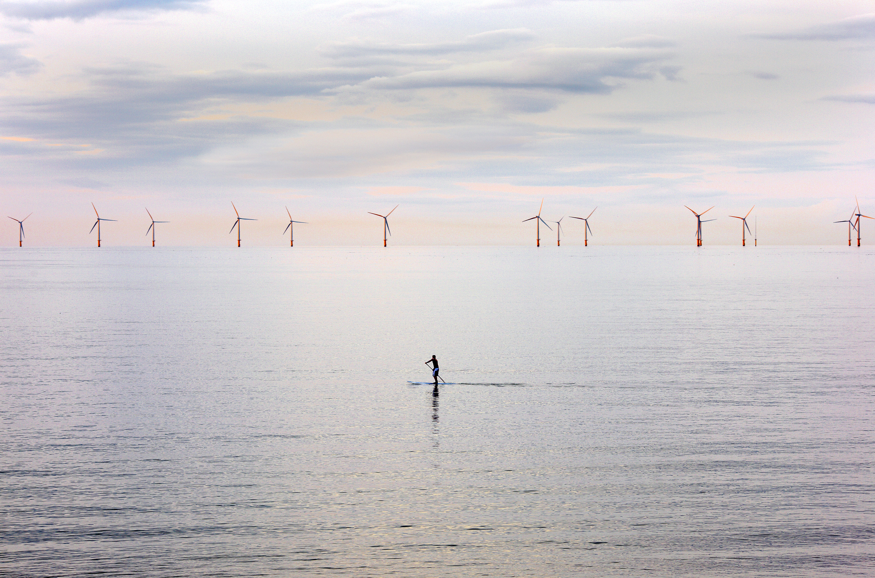 «Серфингист рядом с ветроэлектростанциями на заливе Колвин в северном Уэльсе, Великобритания. Совершенная синергия энергии человека, природы и зелёного транспорта».