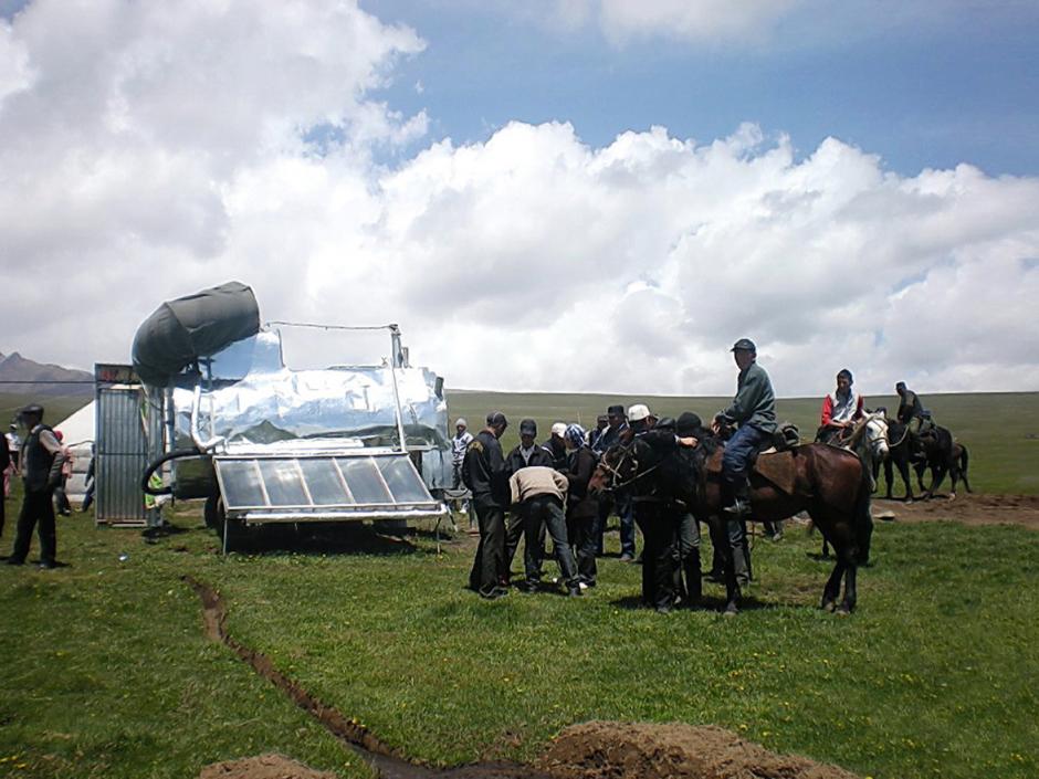 Кыргызстан, с. Дон Алыш, июнь 2011 года. Во время презентации пилотной передвижной биогазовой установки (БГУ –БЭМ-5) с солнечными батареями, установленной для получения топлива и теплой воды для улучшения жизненных условий фермера на джайлоо - высокогорном пастбище, расположенном в 3 000 м над уровнем моря.