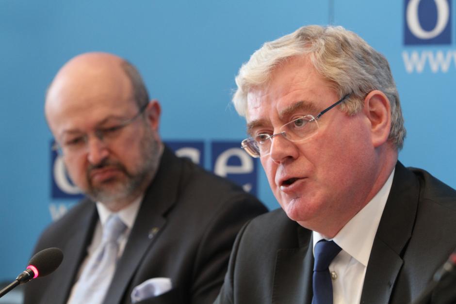 The OSCE Chairperson-in-Office, Irish Deputy Prime Minister and Minister for Foreign Affairs and Trade Eamon Gilmore (r), speaking at a press conference after opening the first OSCE Permanent Council meeting of the 2012 Irish Chairmanship, alongside OSCE Secretary General Lamberto Zannier, Vienna, 12 January 2012.