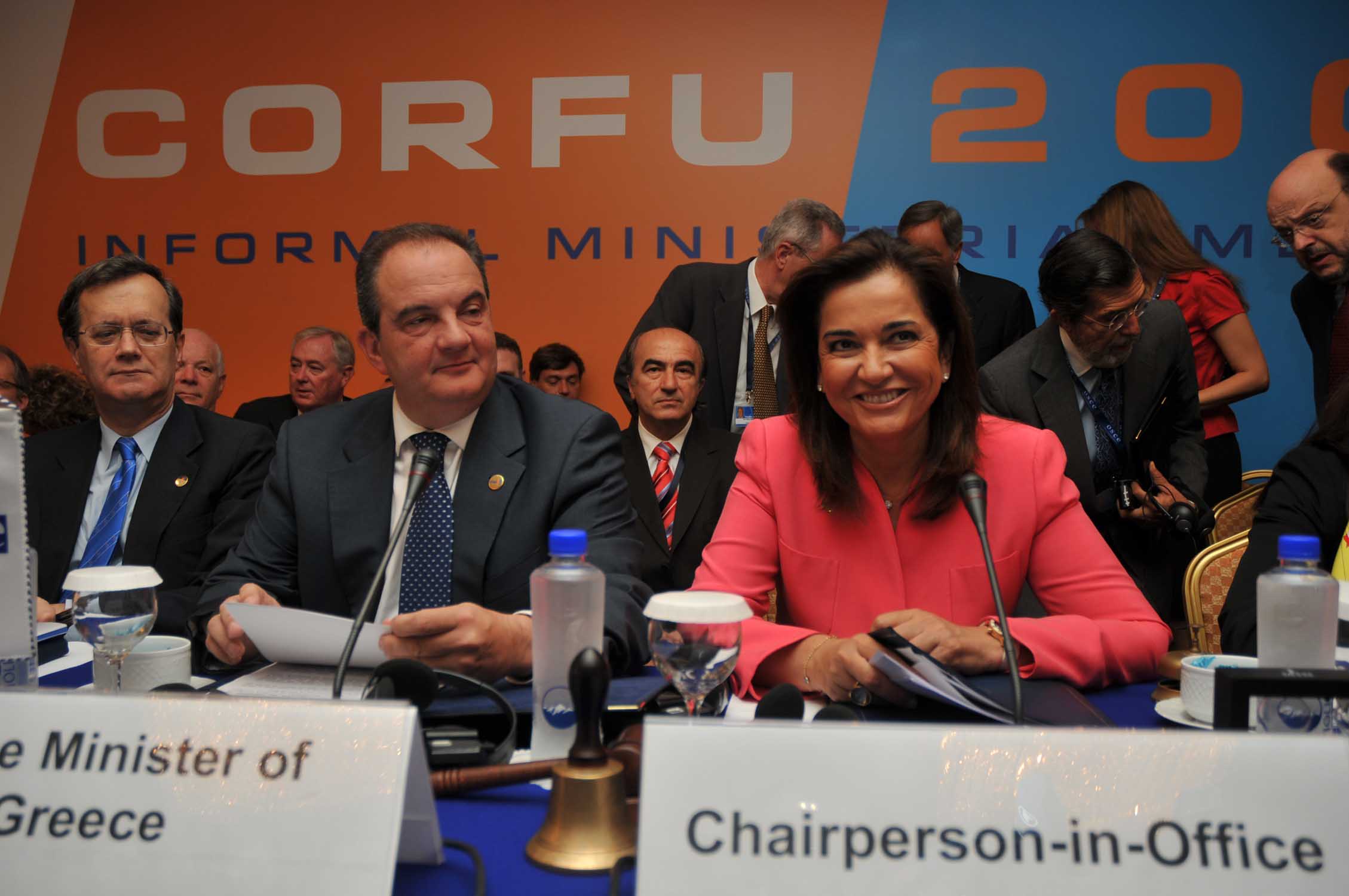 Генеральный секретарь ОБСЕ Марк Перрен де Бришамбо (слева), премьер-министр Греции Коста Караманлис и действующий председатель ОБСЕ и министр иностранных дел Греции Дора Бакояннис на неофициальной встрече министров иностранных дел стран ОБСЕ на Корфу, 28 июня 2009 г.