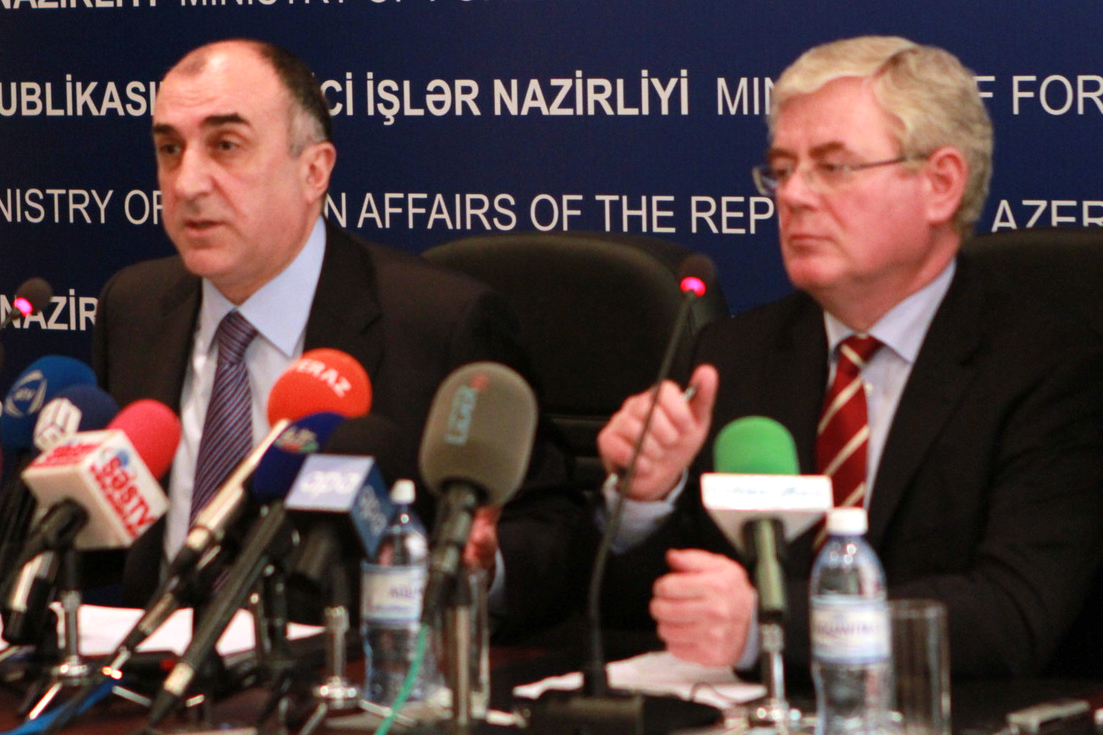 OSCE Chairperson-in-Office, Ireland's Deputy Prime Minister and Foreign Minister Eamon Gilmore (r), listens to Azerbaijani Foreign Minister Elmar Mammadyarov (l) during his visit to Azerbaijan, Baku, 14 June 2012.