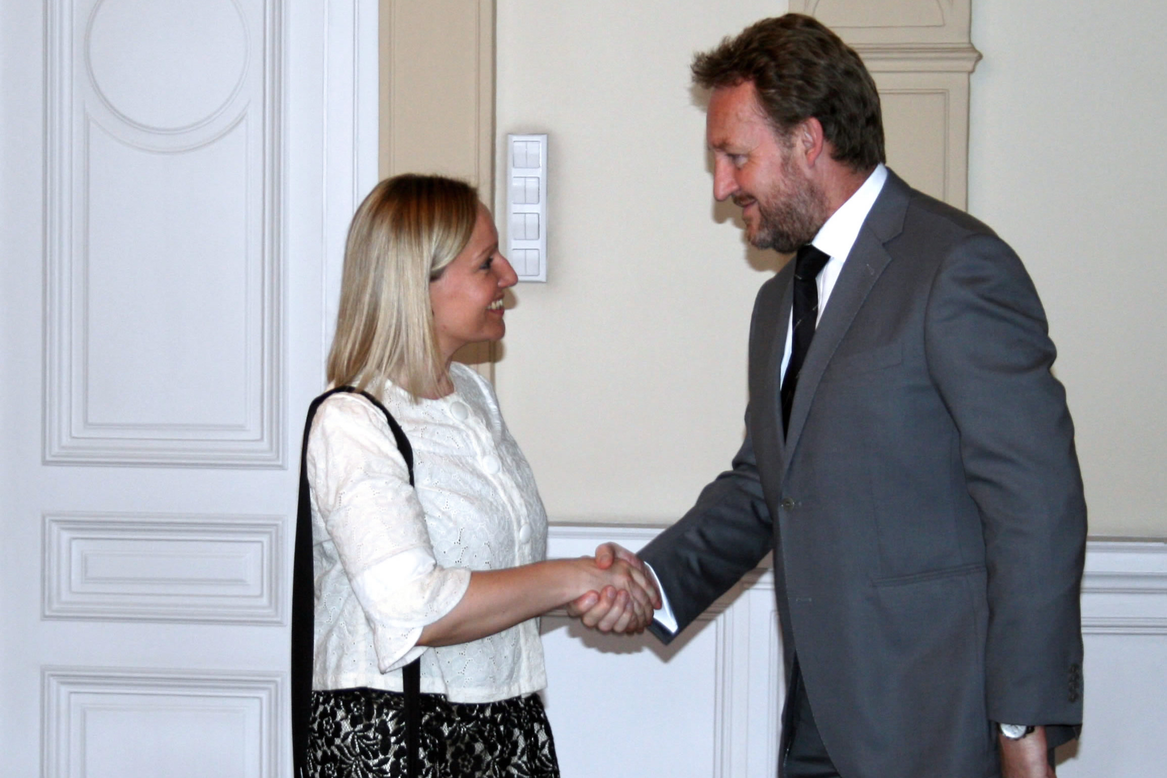 Bakir Izetbegović, Chairman of the Presidency of Bosnia and Herzegovina greets the Representative of the Chairperson-in-Office of the OSCE, Irish Minister for European Affairs Lucinda Creighton, Sarajevo, 9 July 2012.