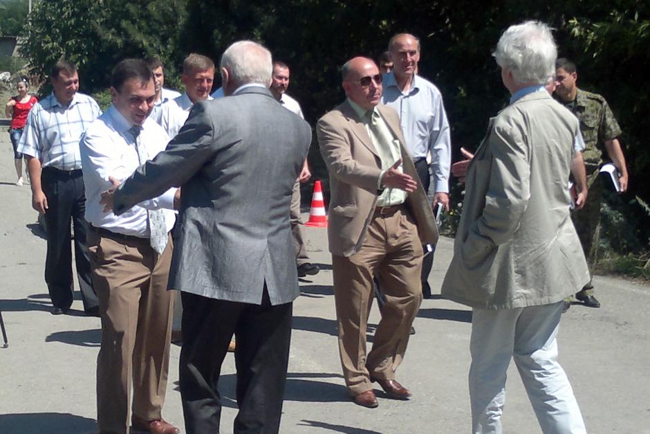 Ambassador Andrzej Tyszkiewicz, Head of the EUMM, and Ambassador Padraig Murphy, Special Representative of the OSCE Chairperson-in-Office for the South Caucasus, greet participants arriving for the 25th IPRM meeting, Ergneti, 26 July 2012.