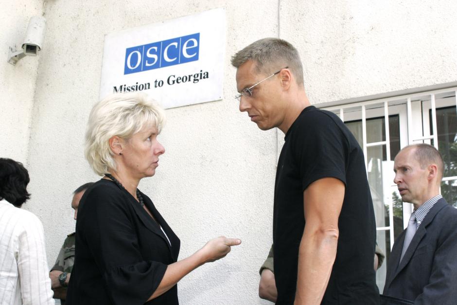 OSCE Chairman Alexander Stubb with Ambassador Terhi Hakala (left), the Head of the OSCE Mission to Georgia, in Tbilisi, 22 August 2008.