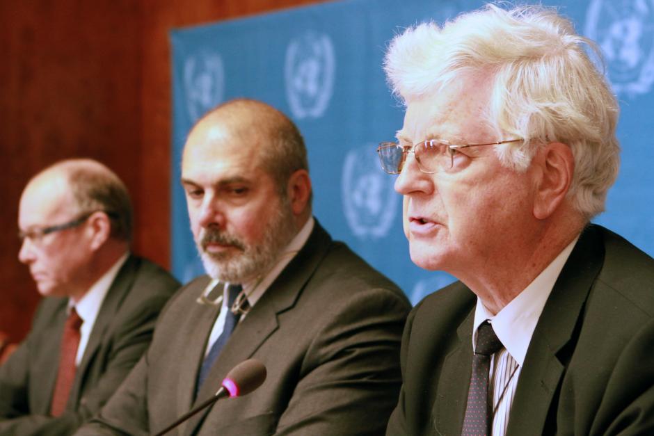 The Co-Chairs of the Geneva International Discussions, Pádraig Murphy (r), the OSCE Chairmanship’s Special Representative for the South Caucasus, EU Special Representative Philippe Lefort (c) and UN Representative Antti Turunen, at a press conference at the United Nations, Geneva, 11 October 2012.