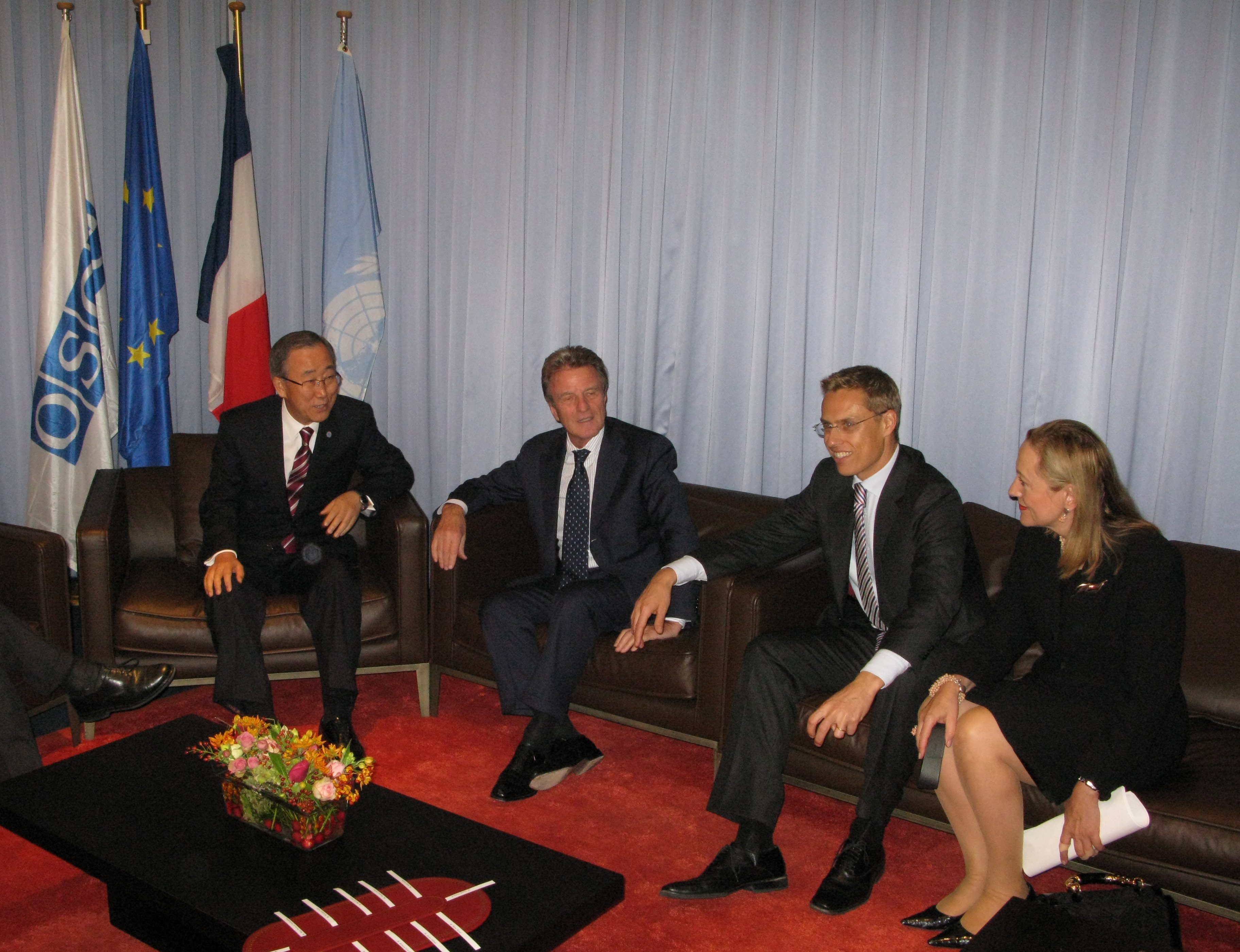 OSCE Chairman Alexander Stubb (right) with French Foreign Minister Bernard Kouchner and United Nations Secretary General Ban Ki-moon (left) in Geneva, 14 October 2008.