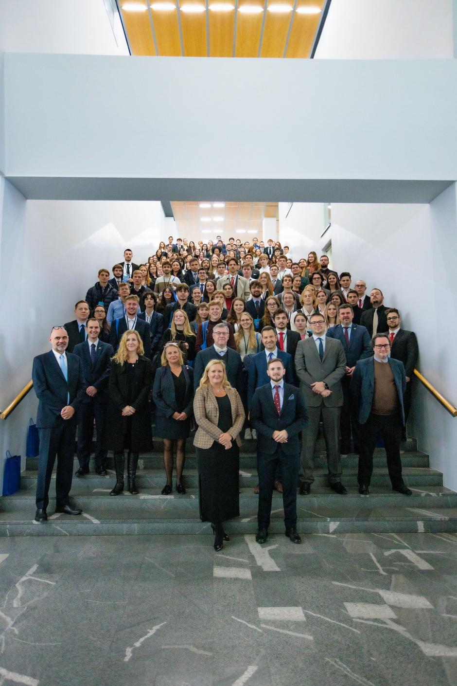 Organizers, invited guests, and participating student teams pose during the OSCE Court of Conciliation and Arbitration’s Moot Court simulation in the framework of the MUNLAWS conference, at the University of Ljubljana, Slovenia 11 November 2022.